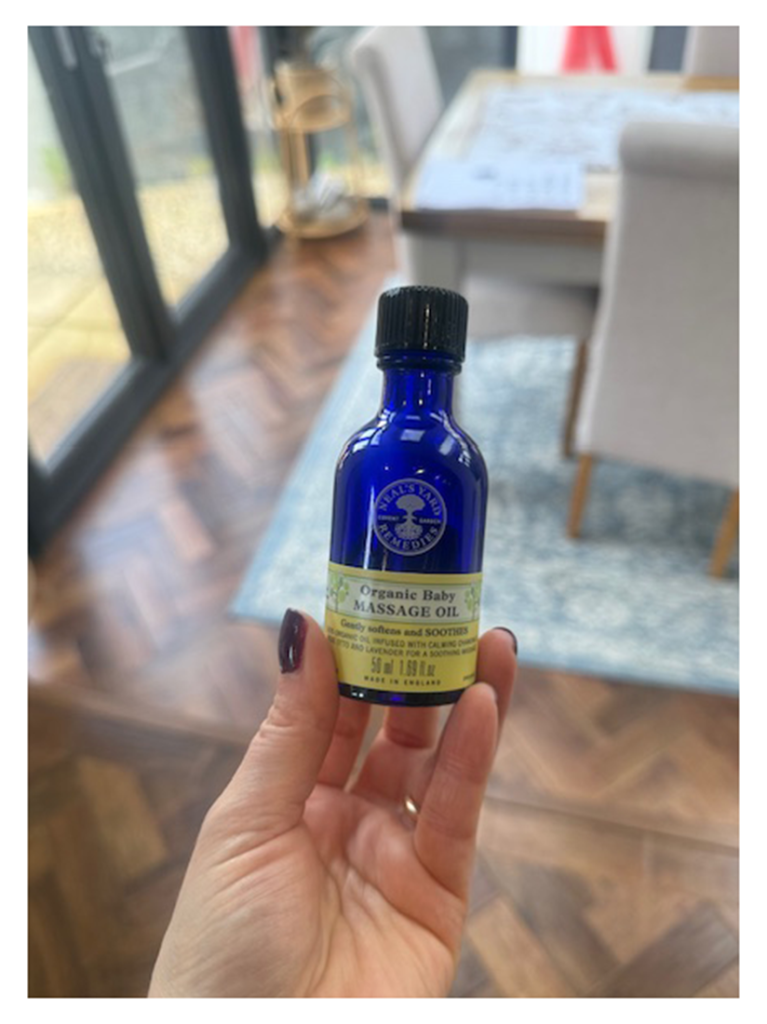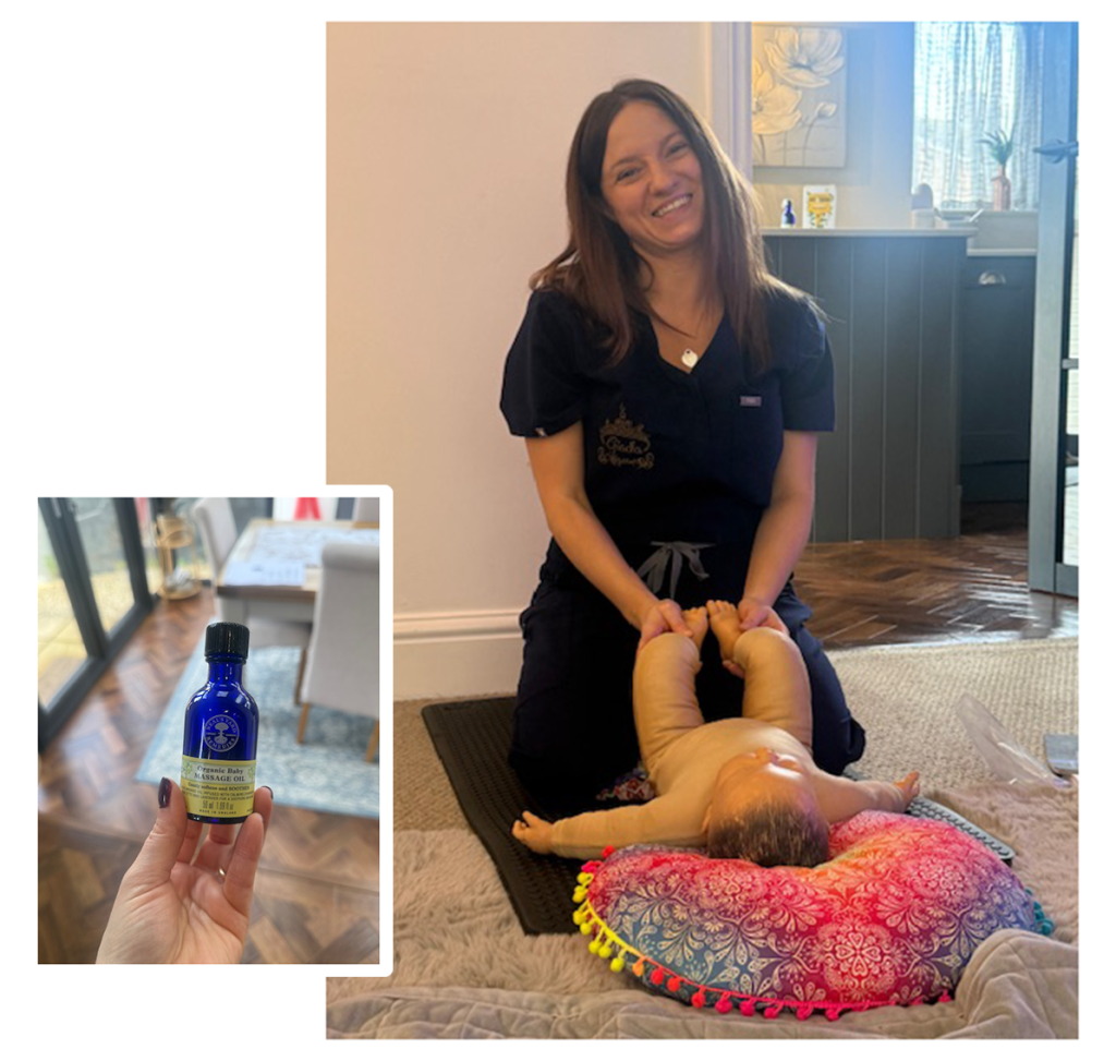 Every session uses Neal’s Yard Organic Baby Massage Oil — a beautifully gentle, certified organic blend that softens and soothes baby’s delicate skin. Infused with calming botanicals, it’s the perfect companion for each and every massage.